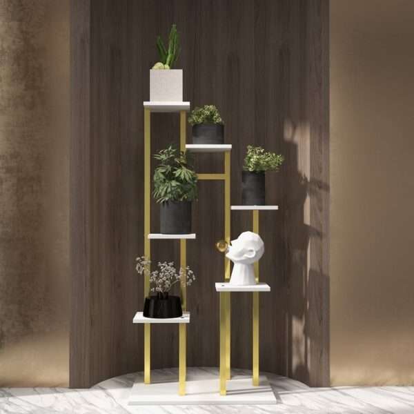 Add charm to your interior with this modern gold 7-tier multi-tier indoor plant stand, constructed sturdily yet stylishly with stainless steel and faux wood material. This will provide ample space to display many of your favorite blooming flowers or plants, with the top weight capacity per shelf at 5kg-functionality and beauty combined.