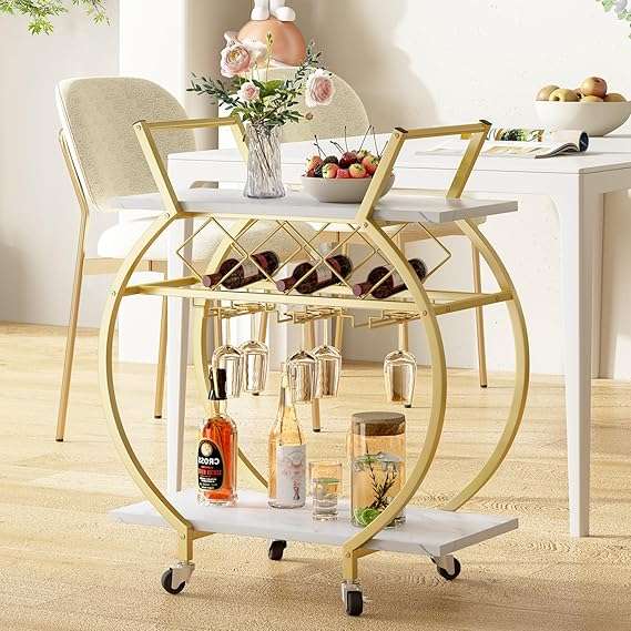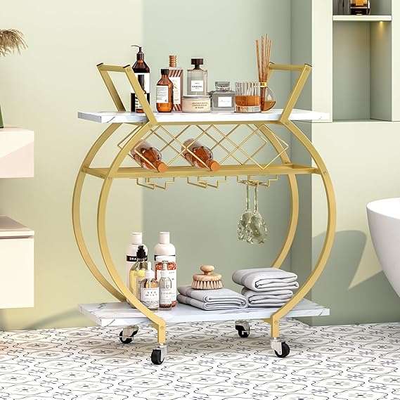 - 【MULTI FUNCTION】This golden bar cart can not only serve as a kitchen service cart, microwave rack cart, beverage cart at parties, but also serve as a wine cart or coffee cart for hotels. With its convenient and versatile design, this mobile tool car will be a good assistant for various gatherings and household storage.