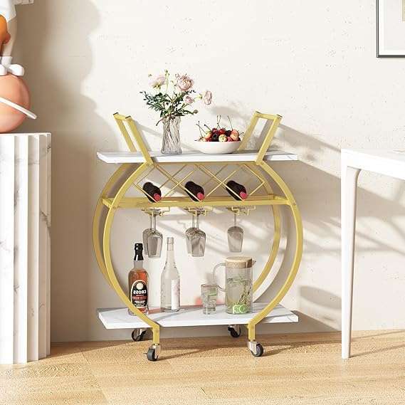 - 【BEAUTIFUL & DURABLE】The Azheruol bar car has a curved gold frame design, and the storage layer is made up of white marble wooden board showcases an elegant and noble sense of modernity.