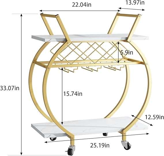 - 【LARGE CAPACITY】The Bar cart measures 25.2*13.98*32.87 inches and has 2 tiers of open display storage shelf. You can put things like wine, snacks, fruit, coffee,cutlery, etc.At the bottom of the first floor, we have added a wine rack that can hold three bottles horizontally and hang up to six wine glasses to meet your needs.