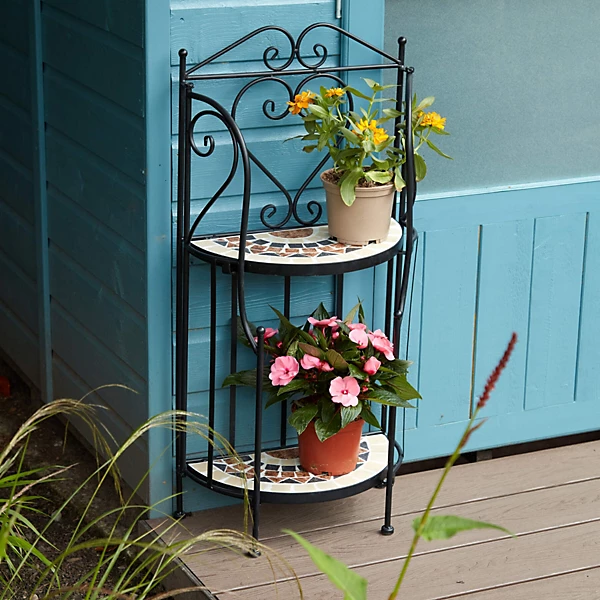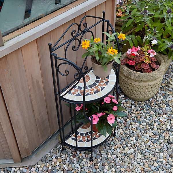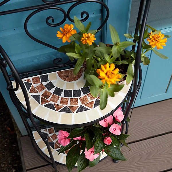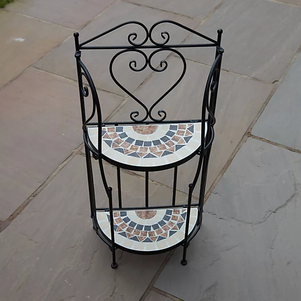 Our Sunflower Metal Plant Stand is in a black powder-coated finish and has scroll detailing on the back. It is decorated with stone tile insets to the two shelves in stunning mosaic patterns. The tiles are then grouted for a polished and smooth finish meaning it is easy to keep clean. The tiled finish gives a Mediterranean feel and is ideal for showcasing your plants either indoors or outdoors. The design means it stands ideally against a wall. Maximum load capacity 5kg.