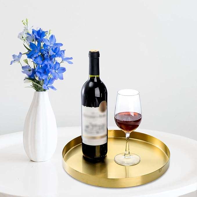 - This decorative round gold tray is made of quality stainless steel with brass coating, luxury and stylish, looking great on your bedroom dresser, bathroom counter, living room, kitchen and more.
